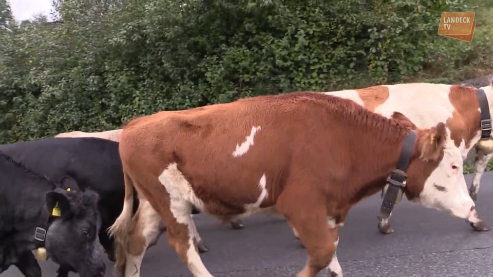 Das Almvieh der Alpe Kaisers wurde per Tiertransport nach Pians gebracht. Vor dem offiziellen Abtrieb nach Quadratsch wurden die Tiere vom Personal der Alpe bekränzt.